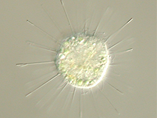 Ich fange mein Futter mit meinen Tentakeln. Die kann ich ausfahren und vorbeischwimmende Beute lähmen bevor ich sie fresse. Ich lebe in Seen und lagere Algen in meine Zelle ein, die aus dem Sonnenlicht noch zusätzlich Nahrung für mich herstellen. Ich bin 50 µm (= 0,05 mm) groß.