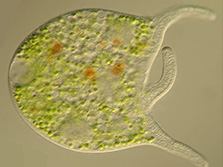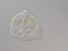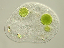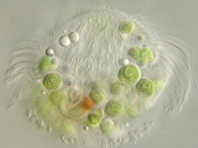 Ich gehöre zum Plankton im See und fresse gerne Bakterien und Algen. Die grünen Kugeln in meiner Zelle sind Algen, die mir helfen mich vor der Sonnenstrahlung zu schützen und mir, durch die Sonne, Futter liefern. Ich bin 150 µm (= 0,15 mm) groß.