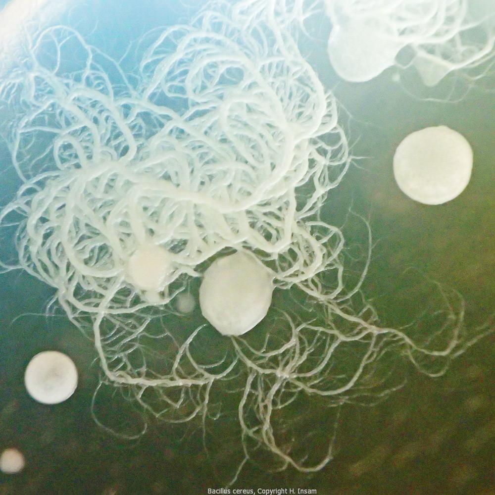 Bild: Bacillus cereus wächst in Schlierenform auf einer Agarplatte. Er gedeiht in unserem Darm und im Ackerboden und ist ein unschädlicher Kommensale (Mitbewohner). Ein enger Verwandter allerdings, Bacillus anthrazis, hat es in sich. Er ist der Erreger des gefährlichen Milzbrandes.
